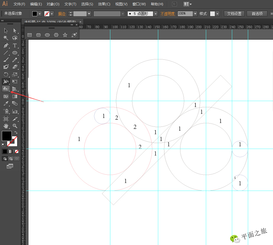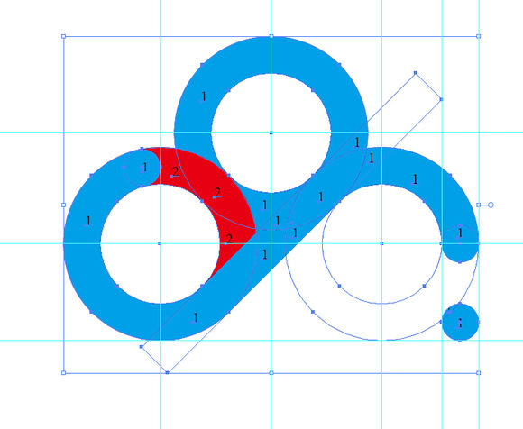 现在画到这里基本上需要的形状就算是完成了,接下来我们要做的就是给LOGO上颜色了。首先在功能栏的视图里将所有的参考线锁定,避免填色时带来不必要的麻烦。先用选择工具全选所有的形状,然后选择工具栏里的实时上色工具,按照下图所示在写有1的地方点击填充蓝色,写有2的地方点击填充红色,具体的颜色数值就不具体说了,因为感觉没有必要,大家就按照个人的喜好填充就好了。