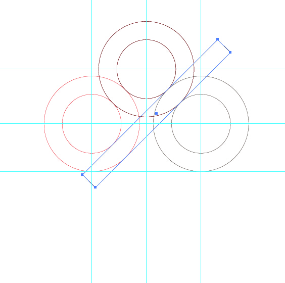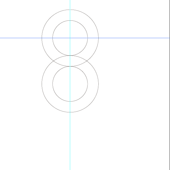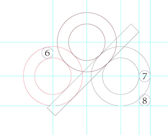 再次选择椭圆工具绘制一个19.1mm*19.1mm的正圆,并且复制两个得到圆6,圆7,和圆8,将其对应的放置在如下图所示的位置,为方便放置可以做参考线来辅助对齐,在这一点上Illustrator的智能参考线功能还是挺强悍的。(注:再次强调,放置的位置必须将相邻的路径完美的重合对齐,否则填充颜色会失败)