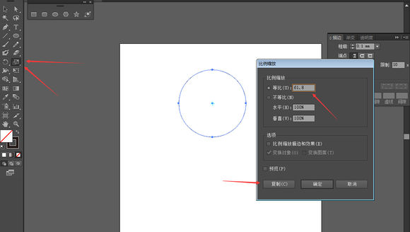 选择比例缩放工具,双击弹出对话框,在等比缩放对话框里输入61.8%然后点击左下角的复制,得到两个重叠在一起的正圆,CTRL+G群组这两个圆