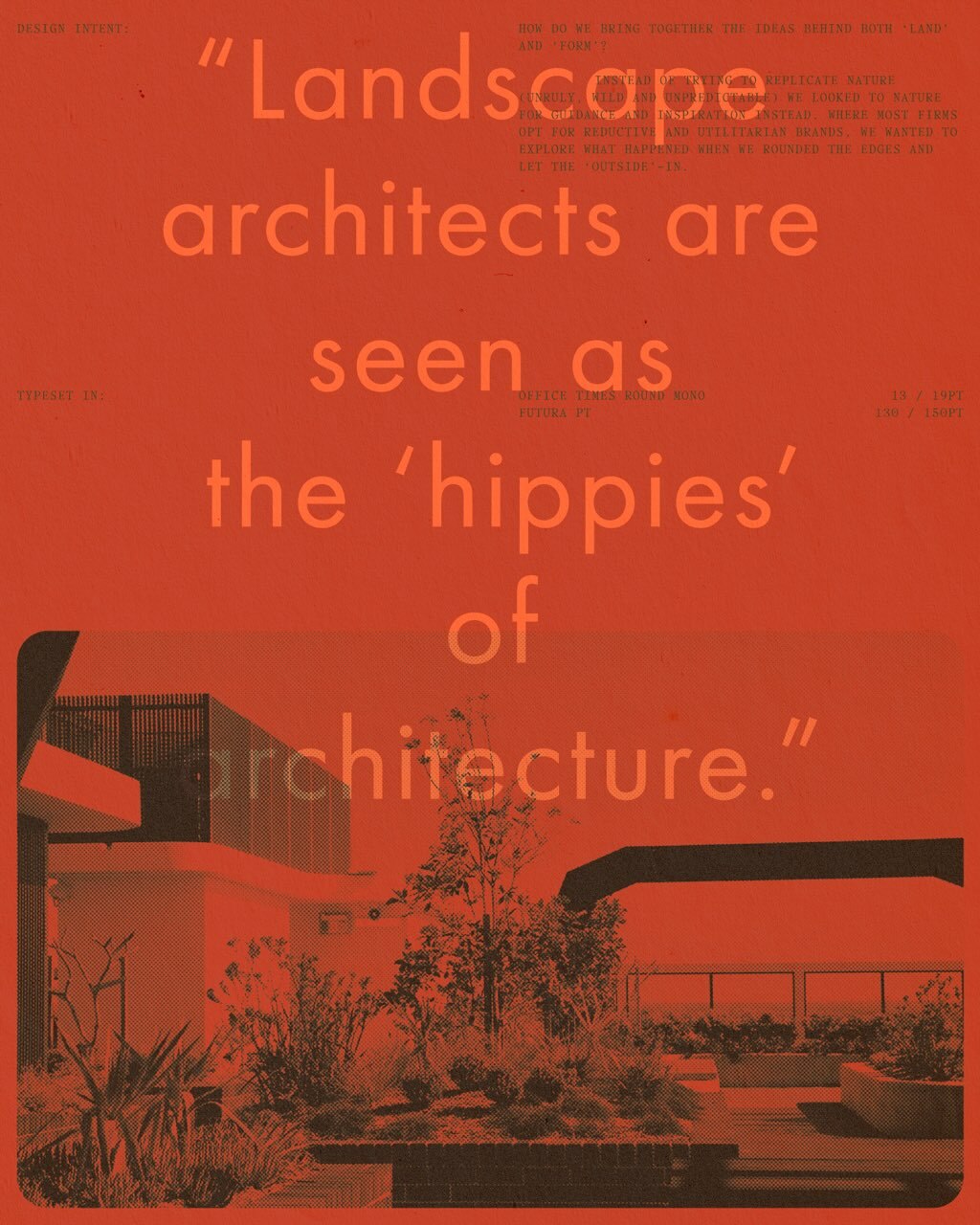 本次品牌刷新以“去功利化设计”为原则,强调企业形象设计中的自然主义表达。Logo采用Reform字体的定制版本,通过倒角边缘与直线的平衡,象征“土地”与“形式”的辩证关系。辅助字体Office Times Mono则强化了现代感与专业度。