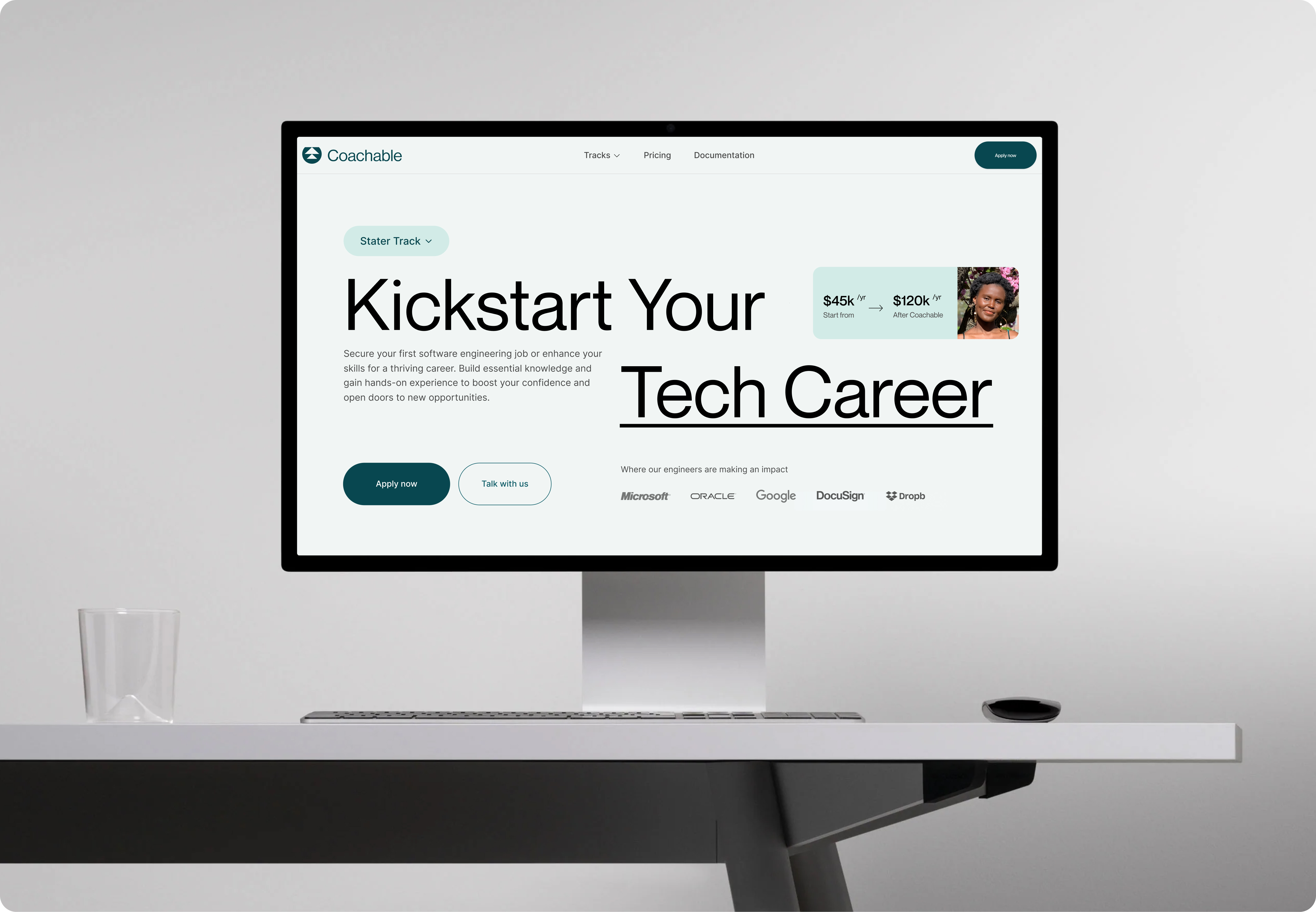 为了体现Coachable带来的实际财务影响,设计团队选择了绿色作为主色调,直接将视觉语言与财务增长和成功联系起来。绿色不仅象征着生机与活力,也寓意着财富与繁荣,与Coachable帮助工程师实现职业发展和收入增长的目标不谋而合。