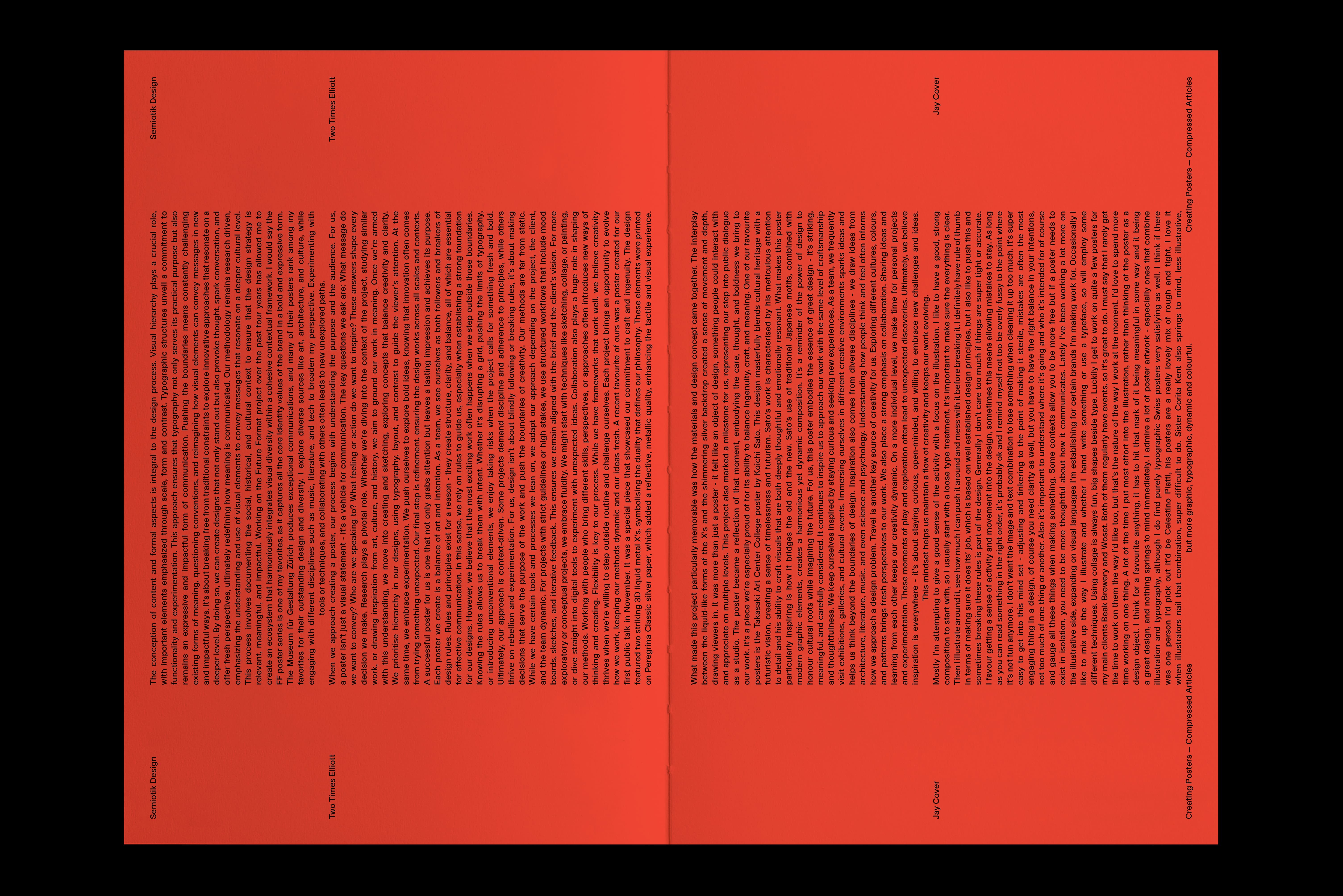 这本书的设计本身也经过深思熟虑,旨在衬托内容,而非喧宾夺主。马歇尔分享道:“在展示每一幅海报时,我希望能尽可能减少视觉干扰,同时,利用这个机会,在那些可能稍显平淡的部分(如标题页和版权信息页)进行更大胆的设计。”这种理念的体现是,在标题页和版权页等部分,使用了充满活力的 PANTONE 805 专色,而正文排版则采用低调中性的无衬线字体,避免与作品本身争夺注意力。
