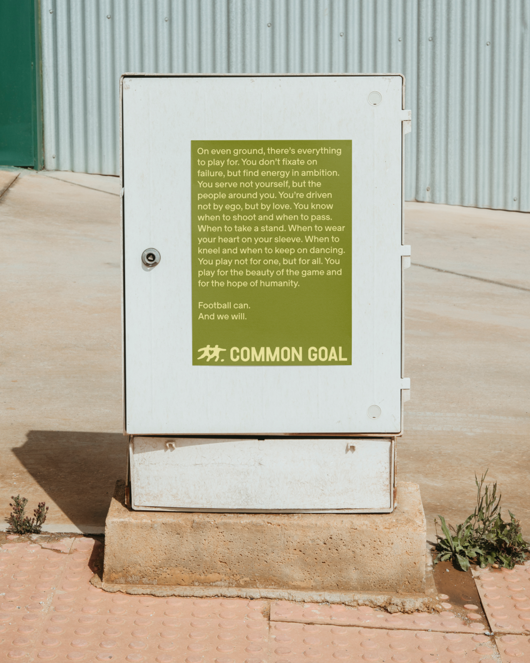 Barkas设计团队精准捕捉Common Goal的核心矛盾:传统慈善品牌常显沉重,而足球自带积极属性。通过品牌策划设计,将”乐观进取”与”社会担当”双重基因注入视觉体系。新vi系统采用RAW定制字体,其手写质感既保留人文温度,又通过锐利笔触传递激进态度,完美平衡专业性与亲和力。